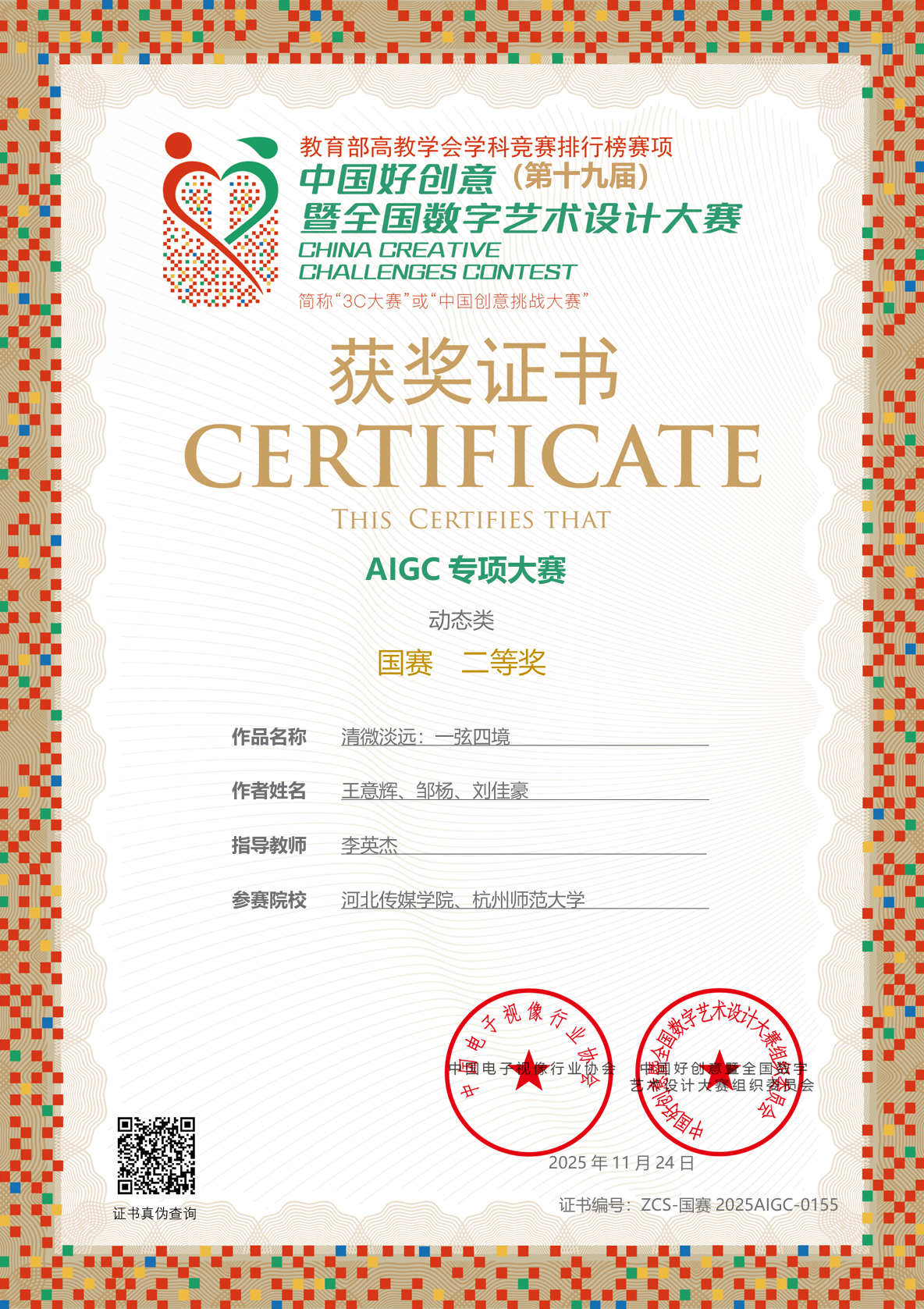 近日,第十九届中国好创意暨全国数字艺术设计大赛(国A级)获奖名单正式揭晓,由美术与设计学院戏剧与影视专业在校研究生王意辉作为核心主创的作品《清微淡远:一弦四境》,凭借卓越的创意与艺术品质,在AI专项大赛动态类单元荣获国赛二等奖。