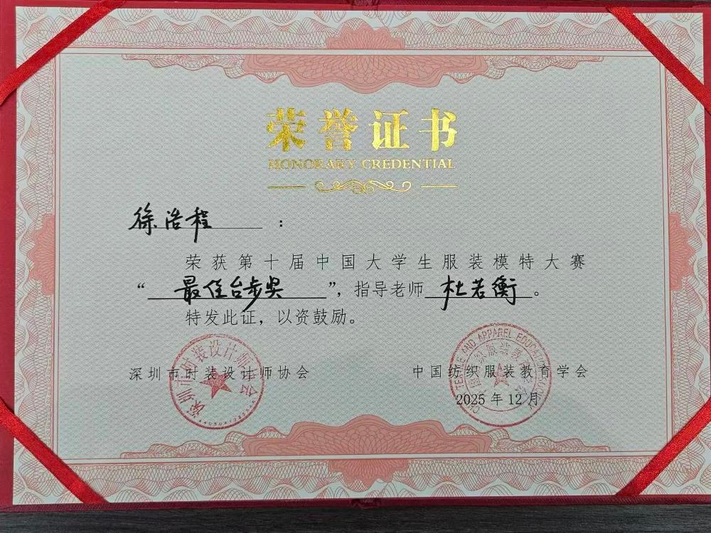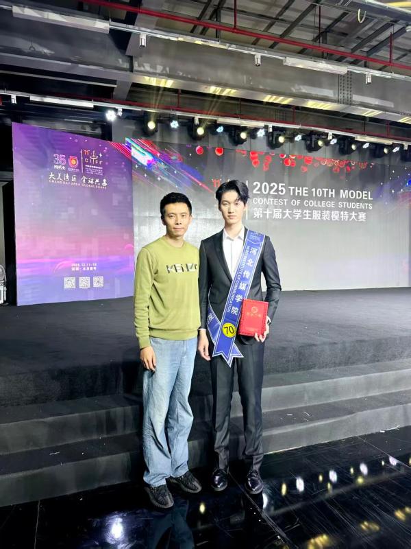 2025年12月18日,河北传媒学院美术与设计学院表演(服装设计与表演)专业三年级学生徐浩程,在第十届中国大学生模特大赛全国总决赛中,历经平面拍摄、专业理论测试及泳装、礼服等环节比拼,最终荣获最佳台步奖,教师杜若衡获优秀指导教师奖。本届大赛从全国百所高校中选拔,经初赛筛选,共有来自70所高校的100名选手晋级总决赛。
