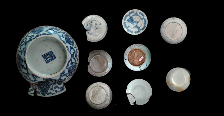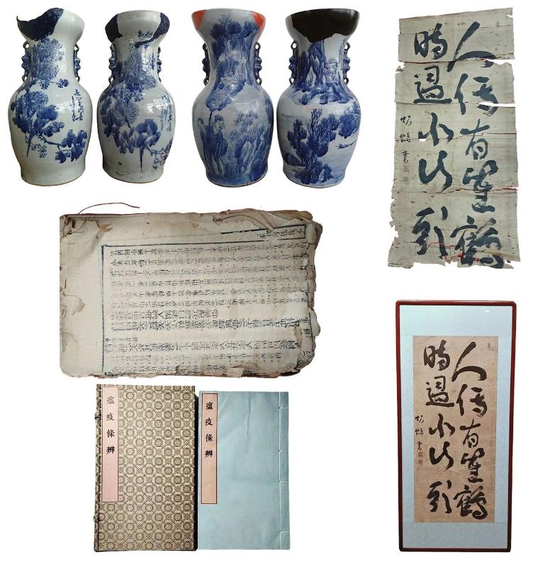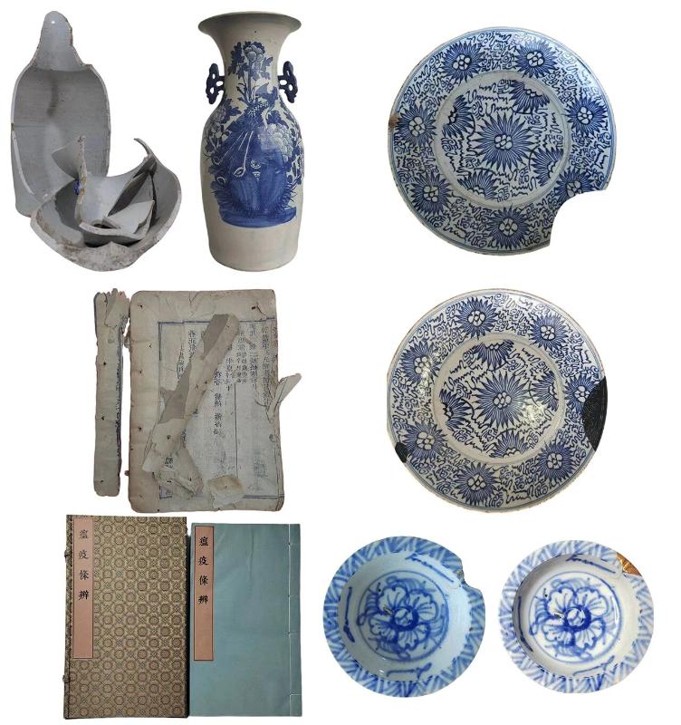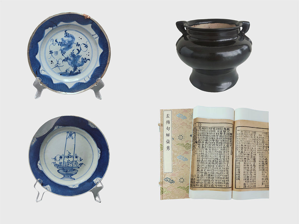 清代青花瓷盘、黑釉双耳炉及古籍修复