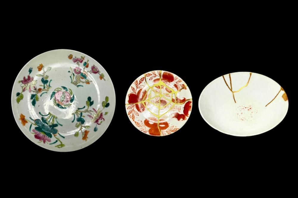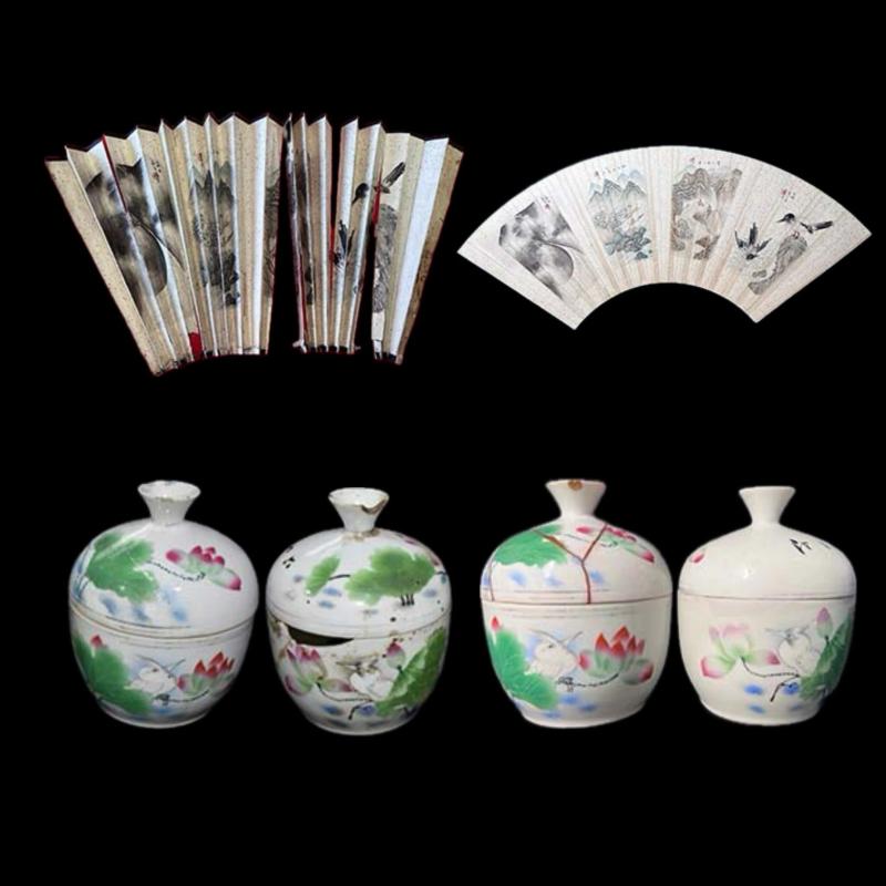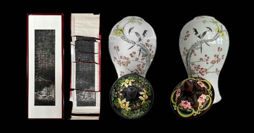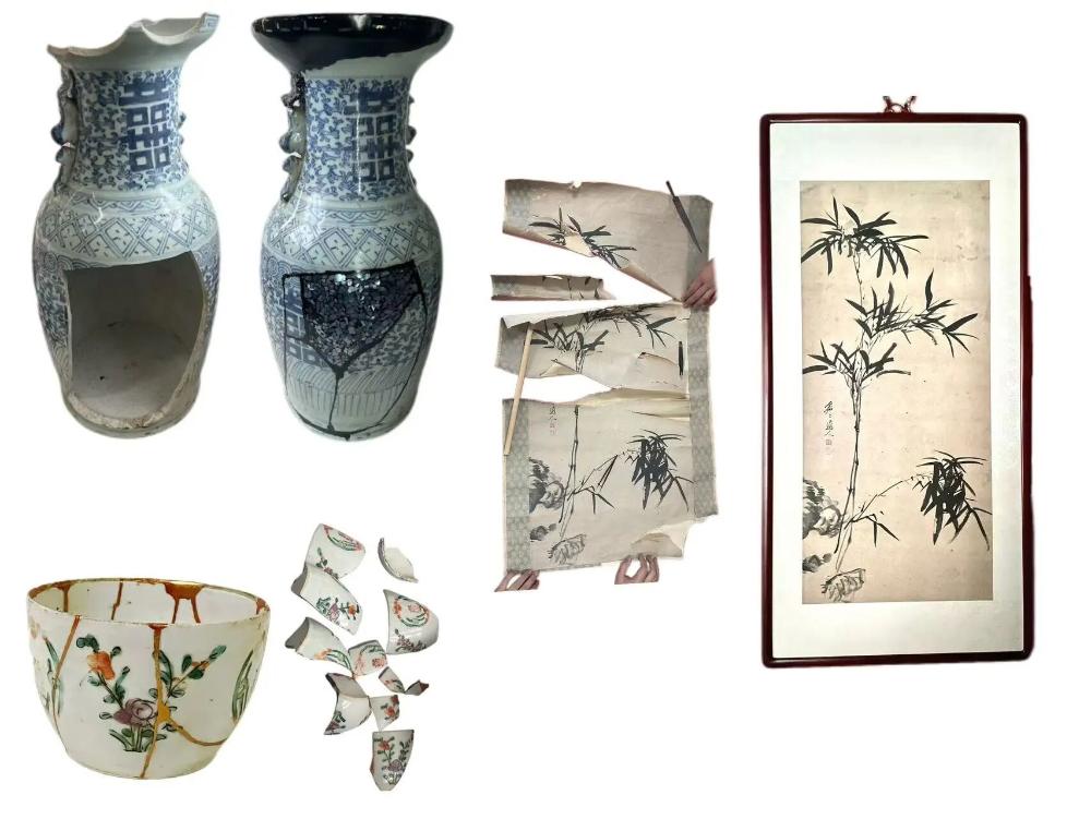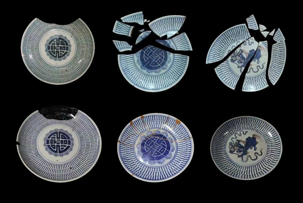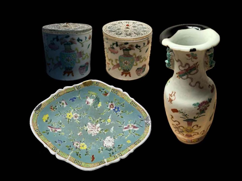清代粉彩花卉纹盘、博古八宝瓷罐、狮耳瓶修复