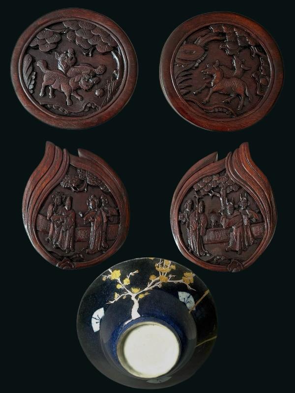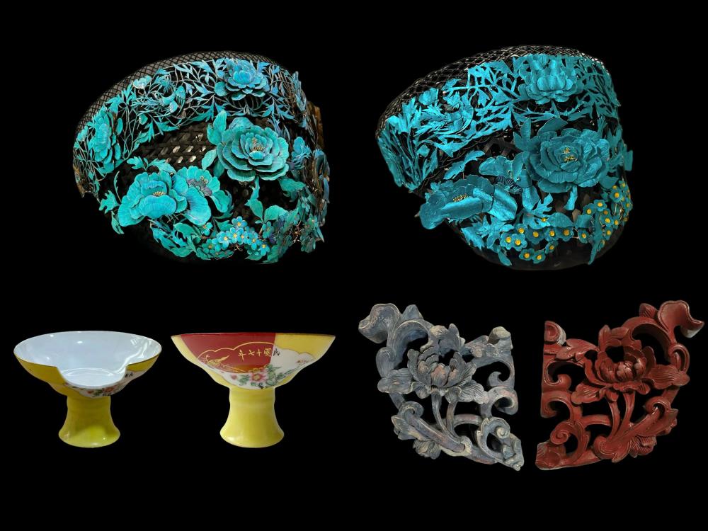 清黑缎嵌点翠凤戏牡丹帽仿制与民国木雕、瓷碗修复
