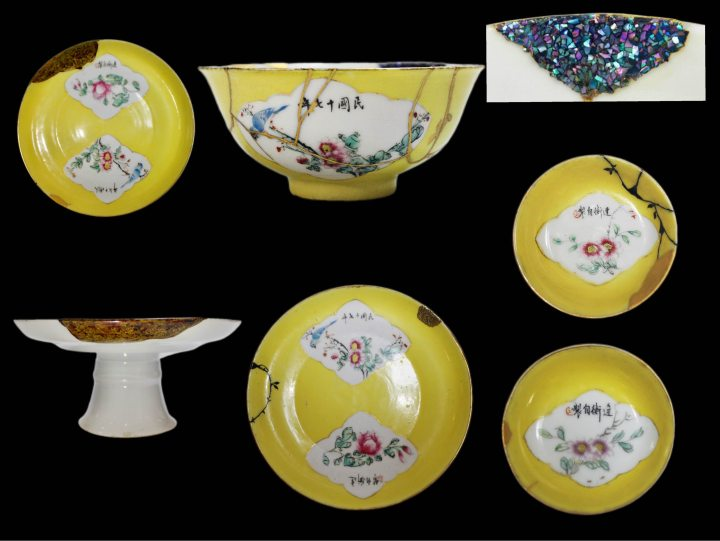 民国矾红彩寿字盘、碗及粉彩四季花卉盘修复