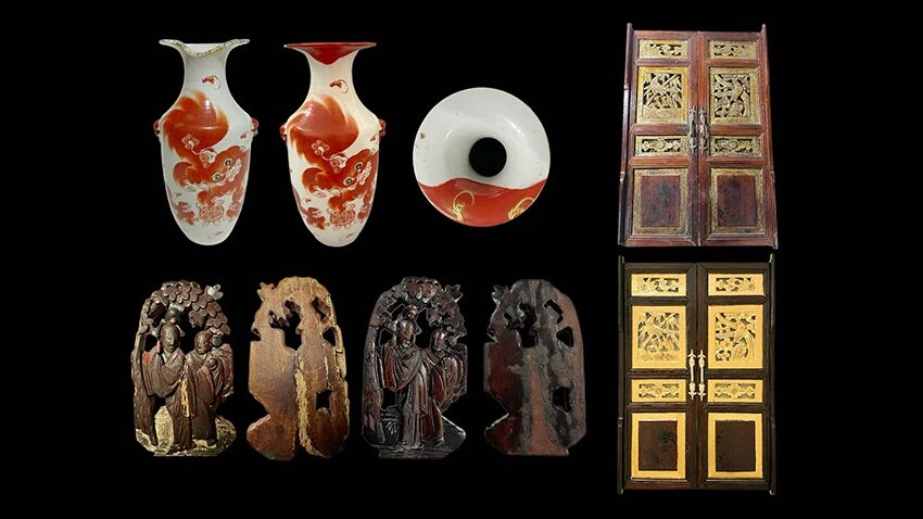 民国红彩狮纹瓶、木雕及现代木雕柜门修复